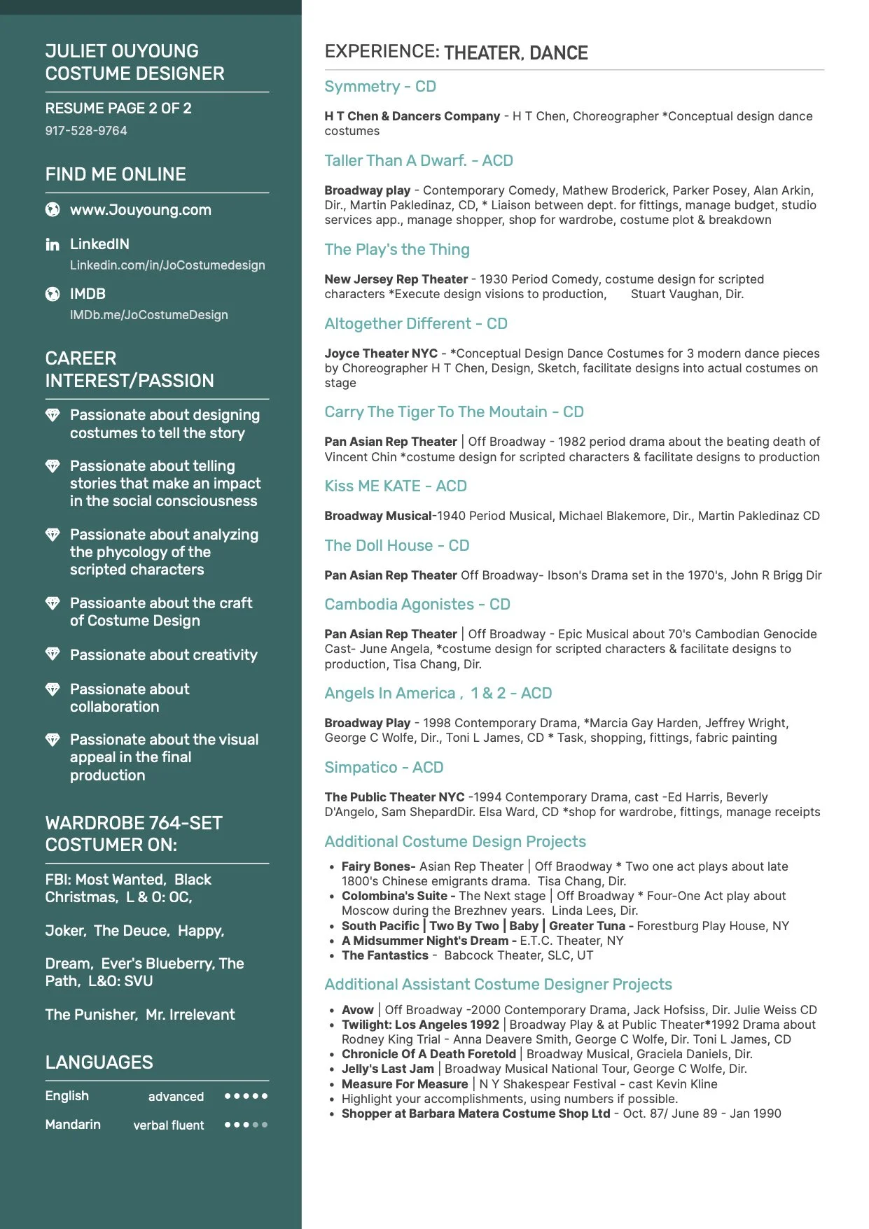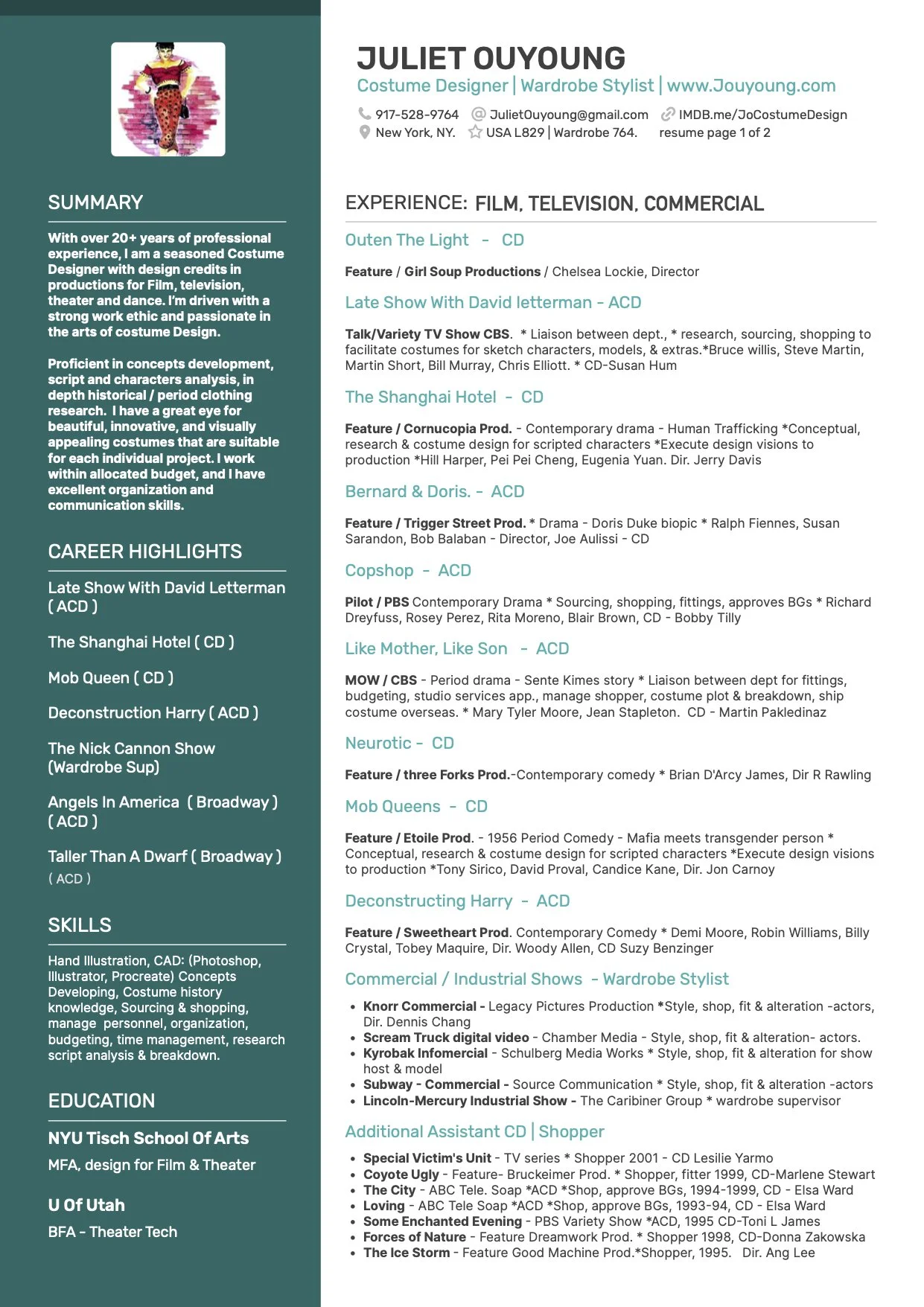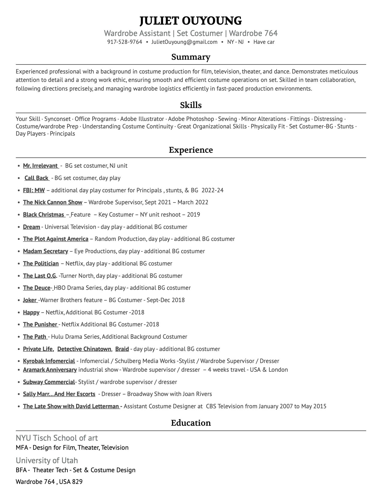 Juliet’s Wardrobe Dept / Set Costumer credits resume